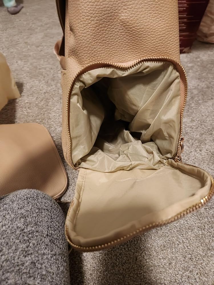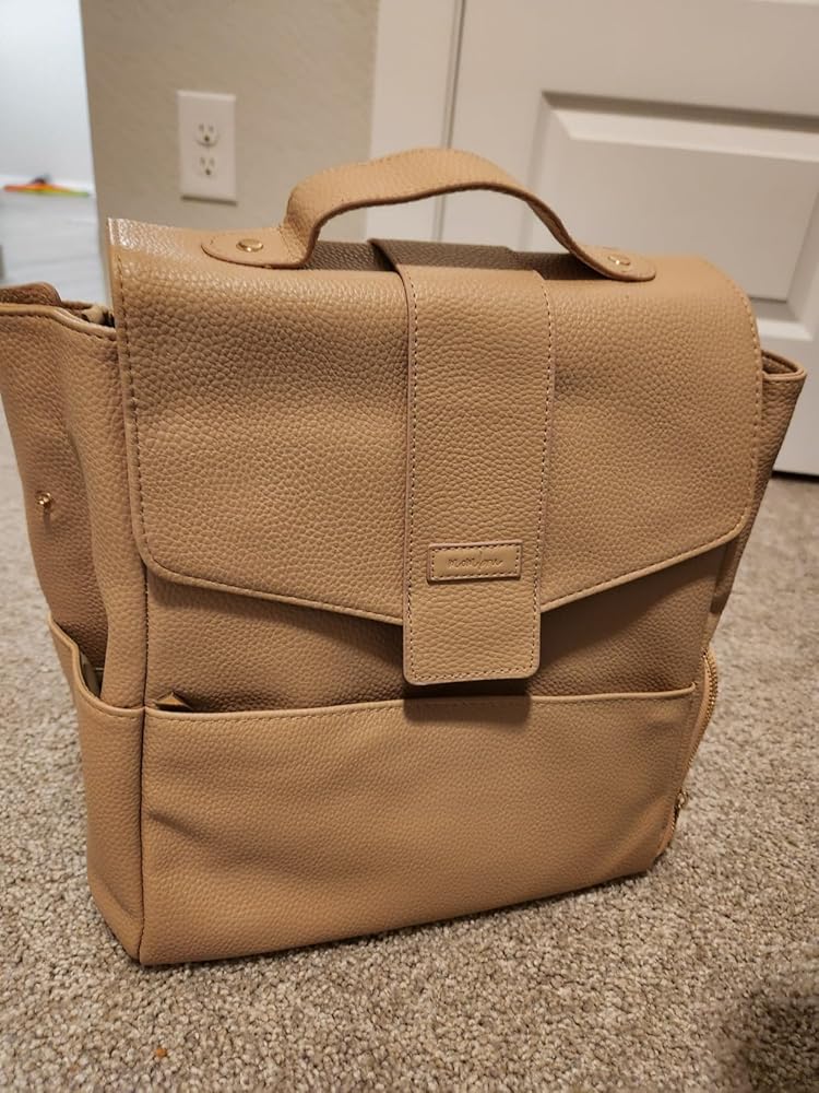 Very cute looking bag. The vegan leather didn't look cheap but it is very stiff. Color is nice. The lining is not as great quality. It's a bit scratchy and stiff. It's a nice size bag. Not to large like other diaper bags but the side pocket for the pumps will reduce the inside storage space by a large margin. The bag itself is a bit heavy so adding all your pump parts will make it feel a bit uncomfortable on your back if you want to wear this like a backpack. The straps aren't really located in the right place on the bag to have the weight of the bag sit well on your back. It feels like it's tipping away while you wear it. I do like that you do have the option of wearing that way or using one strap. Just wish that design was a little better thought out to have to work better both ways.